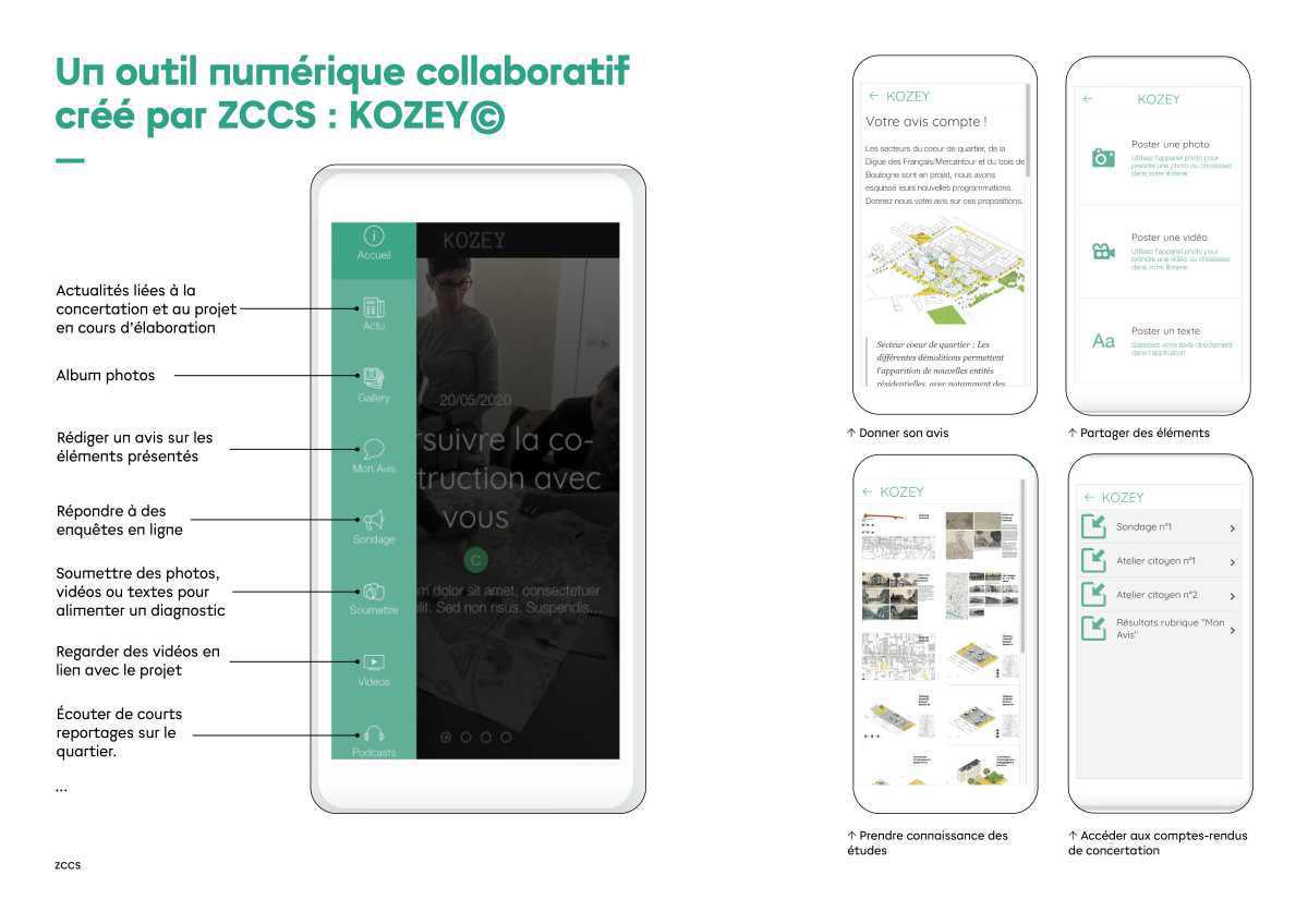 Kozey permet aux habitants et usagers de partager des textes, images, photographies ou vidéos, de répondre à des sondages, mais aussi de réagir et de commenter des plans ou esquisses de projet, et ce, durant toute la durée du projet et/ou de la concertation.